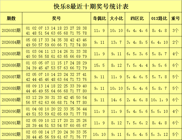 福彩快乐8第2026092期开奖回顾:02 03 08 14 17 20 24 30 33 35 38 44 45 56 59 61 67 71 76 77,其中奖号奇偶比为10:10,大小比为9:11,四区比为6:5:4:5,012路比为5:3:12,重号5个:02、17、20、44、67。